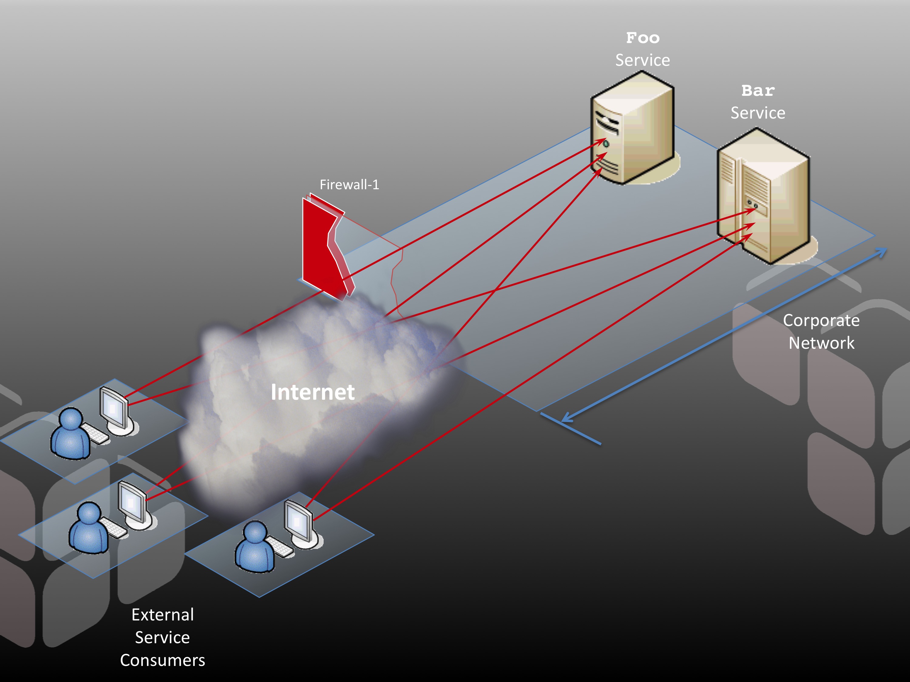 The first thing you should notice is that the firewall is open to allow the external clients to make their direct connections with the service hosts. In other words, these hosts are, for all intents and purposes, deployed in the DMZ and must be hardened under that assumption. For many applications, this is a non-trivial exercise. Hopefully, your internal alarm bells are going off already.