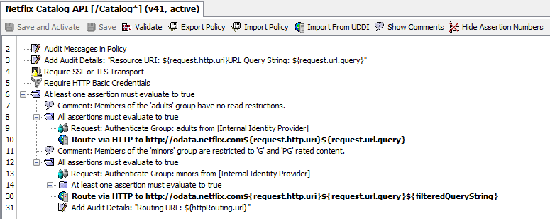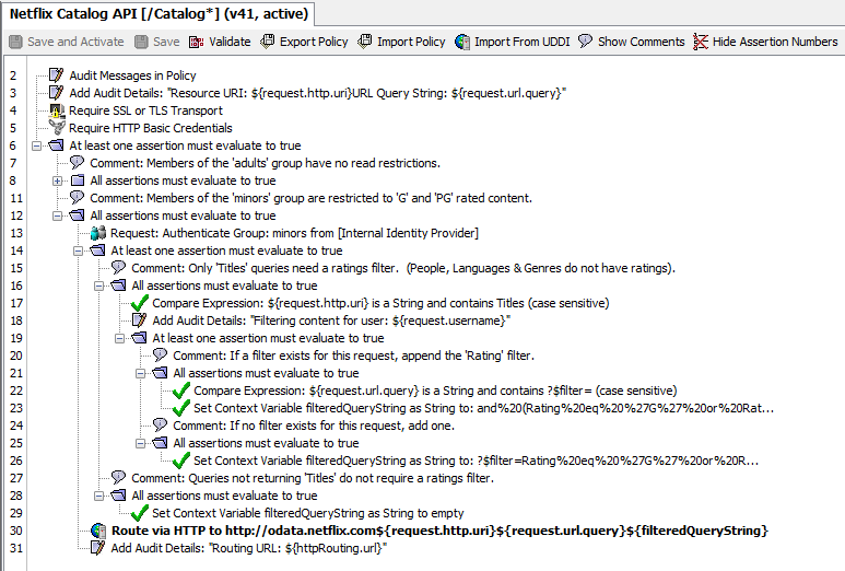 First off, the policy throws an explicit audit to capture both the URI and the query string for debugging purposes. We then ensure that the connection uses SSL (and subject to the cipher suite constraints currently in effect), and we mine HTTP basic credentials from the connection. Need Kerberos or SSL client-side certificate authentication instead? Just drag the assertions implementing either of these into the policy and you are good to go.