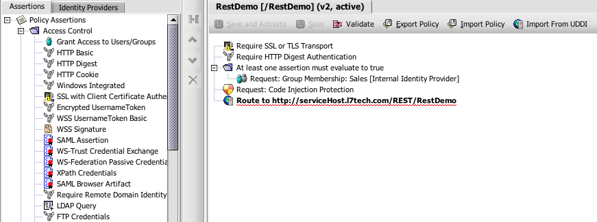 In this policy, I’m ensuring that the REST client is using SSL for three things: confidentiality, integrity, and server authentication. I could require client-side certificate authentication here, but instead I’m using HTTP digest, to emphasize the requirement to avoid using plain text HTTP basic or simple user keys. I’m authorizing access based on group membership here, restricting access to members of the sales group.