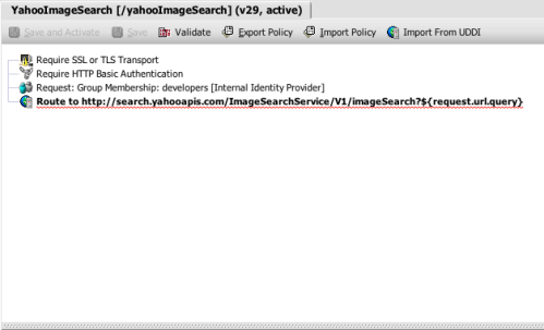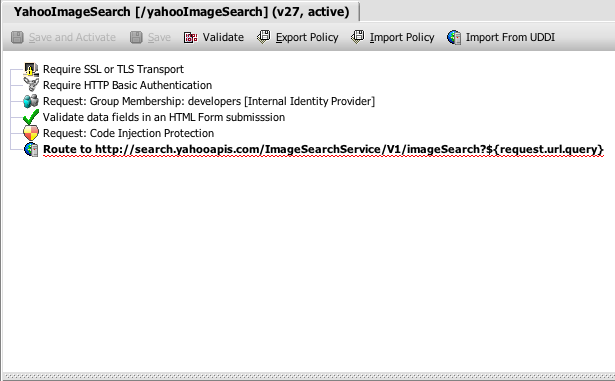 Now let’s add some security. I’d prefer that nobody on the Internet learns that I’m searching for pictures of Madge, so we need to implement some privacy across the transaction. I can drag-and-drop an SSL/TLS assertion into the top of my policy to ensure that the gateway will only accept SSL connections for this RESTful service. Next, I’ll put in an assertion that checks for credentials using HTTP basic authentication. I’ll use the internal identity provider to validate the username/password combination. The internal identity provider is basically a directory hosted on the SecureSpan Gateway. I could just as easily connect to an external LDAP, or just about any commercial or open source IAM system. As for authentication, I will restrict use of the yahooImageSearch REST service to members of the development group: