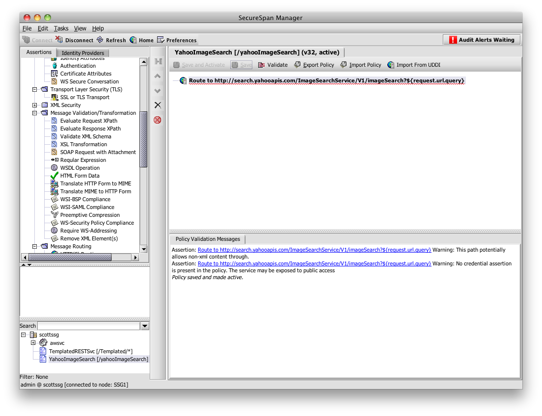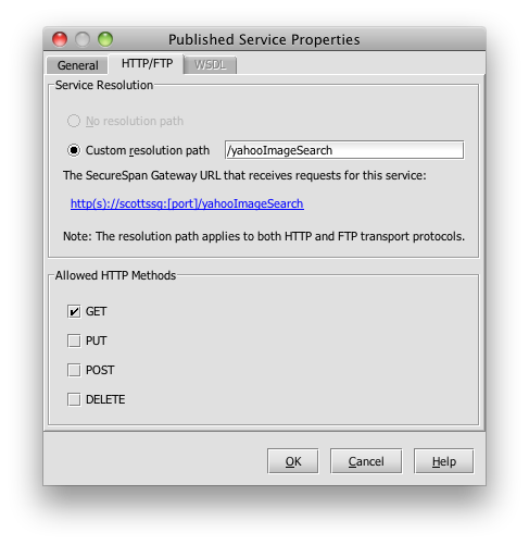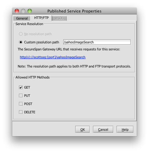 If need be, I could easily add wild card characters here to cover a range of incoming URLs. For this demonstration, I’m just running a virtual SecureSpan Gateway here on my Macbook; it’s not actually residing in the Yahoo DMZ, as would be the case in a real deployment. But from the perspective of an administrator building policy, the process is exactly the same regardless of where the gateway lives.