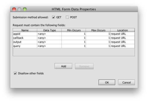 The form data assertion allows me to impose a series of tight constraints on the content of query parameters. In effect, it let’s me put a structural schema on an HTTP query string (or POST parameters). I’m going to be very strict here, and explicitly name every parameter I will accept, to the exclusion of all others. For the Yahoo search API, this includes: