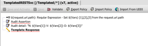 URI templates are also very easy to process on a SecureSpan Gateway. Here’s a policy that demonstrates how to access the variables in the URI. Basically, all this policy does is parse up the URI, audit the results, and echo the content back to the sender: