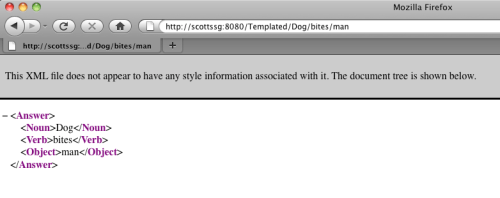 When I fire up my browser and hit the REST service http://scottssg:8080/Template/Dog/bites/man I get: